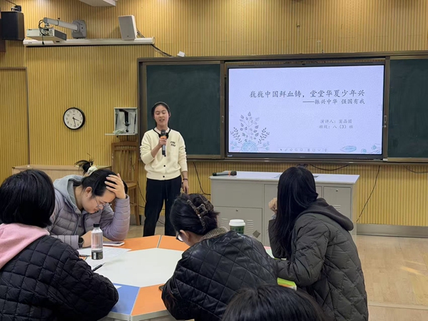 比赛开始,各位选手根据赛前抽签顺序上台演讲。选手们在台上从容自信地阐述自己的见解,通过列举历史名人事例到他们身上显露出的品质,再以此延伸出中国民族精神在新时代给予我们的启示。有选手以黄旭华院士为国家潜心研制核潜艇来高声赞扬钻研精神;有选手用林则徐虎门销烟来传递"苟利国家生死以"的奉献精神;还有选手通过抗美援朝战争时期,中国人民志愿军保家卫国的坚定意志来诠释何为"清澈的爱,只为中国"。每位选手演讲完毕,台下总会响起雷鸣般的掌声,这不仅是对演讲者们的准备与付出的尊重,也体现了我们作为华夏子孙对中华文化的认同感。