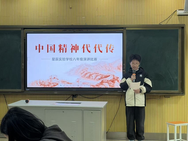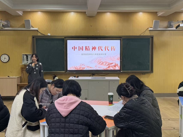 2025年12月17日下午3时,八年级"中国精神代代传"演讲比赛于本校观摩教室3顺利举行。本次演讲比赛由八年级各班派1名选手参赛,对自己心目中的中国精神进行阐释,发表自己的观点,并由唐蕴玉副校长、团委徐滋洁书记、政教处主任助理唐梦婷老师以及语文组张怡蓓、钱欣欣老师五名评委与台下50名观众进行打分,旨在发扬新时代中国精神的内涵。