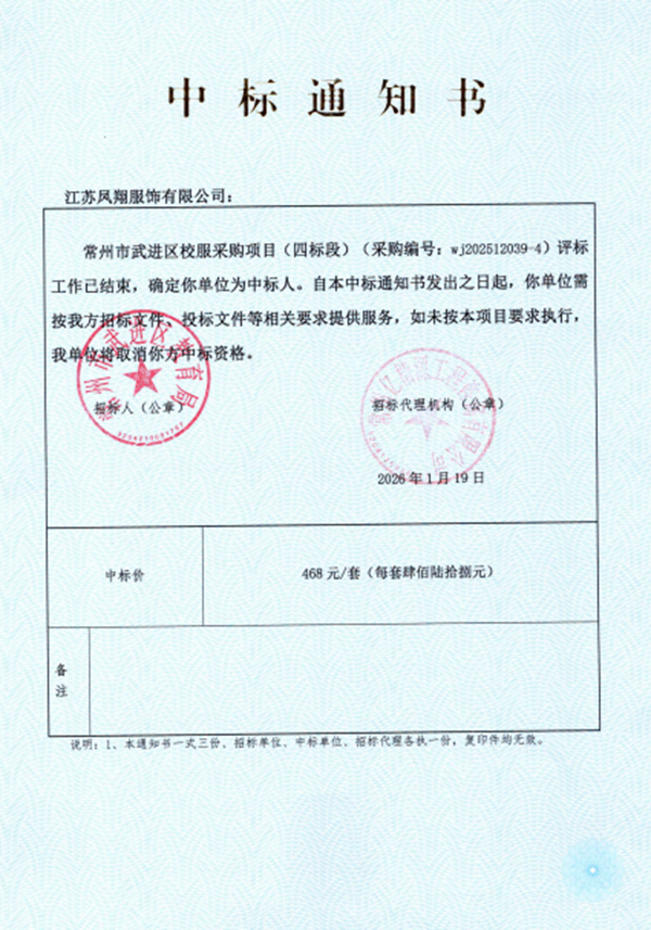 1.中标单位:江苏凤翔服饰有限公司(小学),常州洛神洋装服饰有限公司(初中)